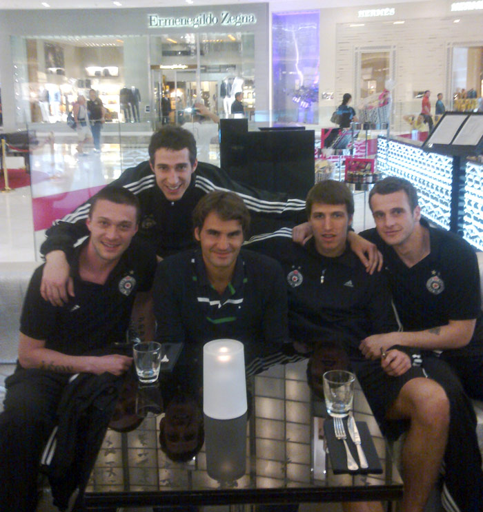 "Épp a bajnokainkkal sétáltunk, amikor egy másik bajnokba futottunk bele, Roger Federerbe, aki épp vásárolgatott a feleségével, még a tornája előtt, ami itt lesz Dubaiba február 18-tól. Az hogy nagyszerű sportember,és hogy úriember az hamar kiderült....ahogy meghallotta hogy Szerbiából jöttünk meghívott minket egy italra. Természetesen elfogadtunk a meghívást, és az italozás mellett beszélgettünk a teniszről, a fociról, hiszen tudtuk, hogy Federer szereti a focit, a mi csapatunk pedig a teniszt. A végén csináltunk képet emlékbe, és mindent jót kívántunk egymásnak."