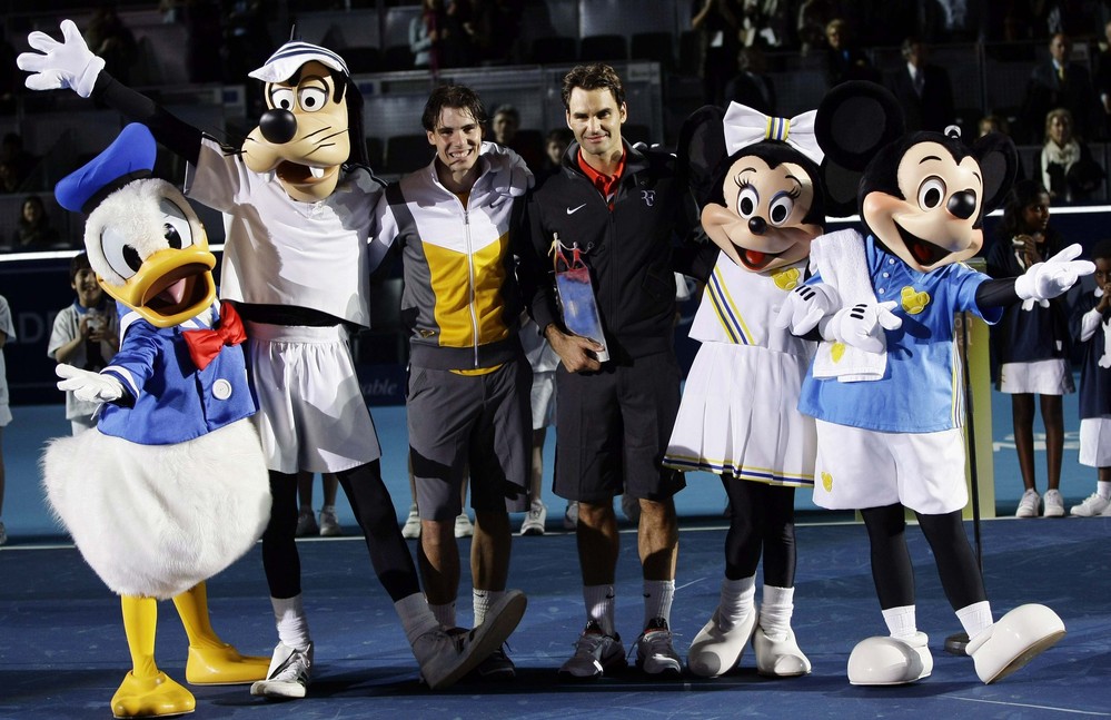 Ahogy azt sejteni lehetett, a tegnapi bemutatót Nadal nyerte, 6:7 6:4 1:6-ra. Ez most sokkal látványosabb és élvezhetőbb volt szerintem, mint a zürichi bemutató. A meccs végén pedig megérkeztek a pályára Disneyland figurái is, és Goofy jól megölelgette Rogert :D